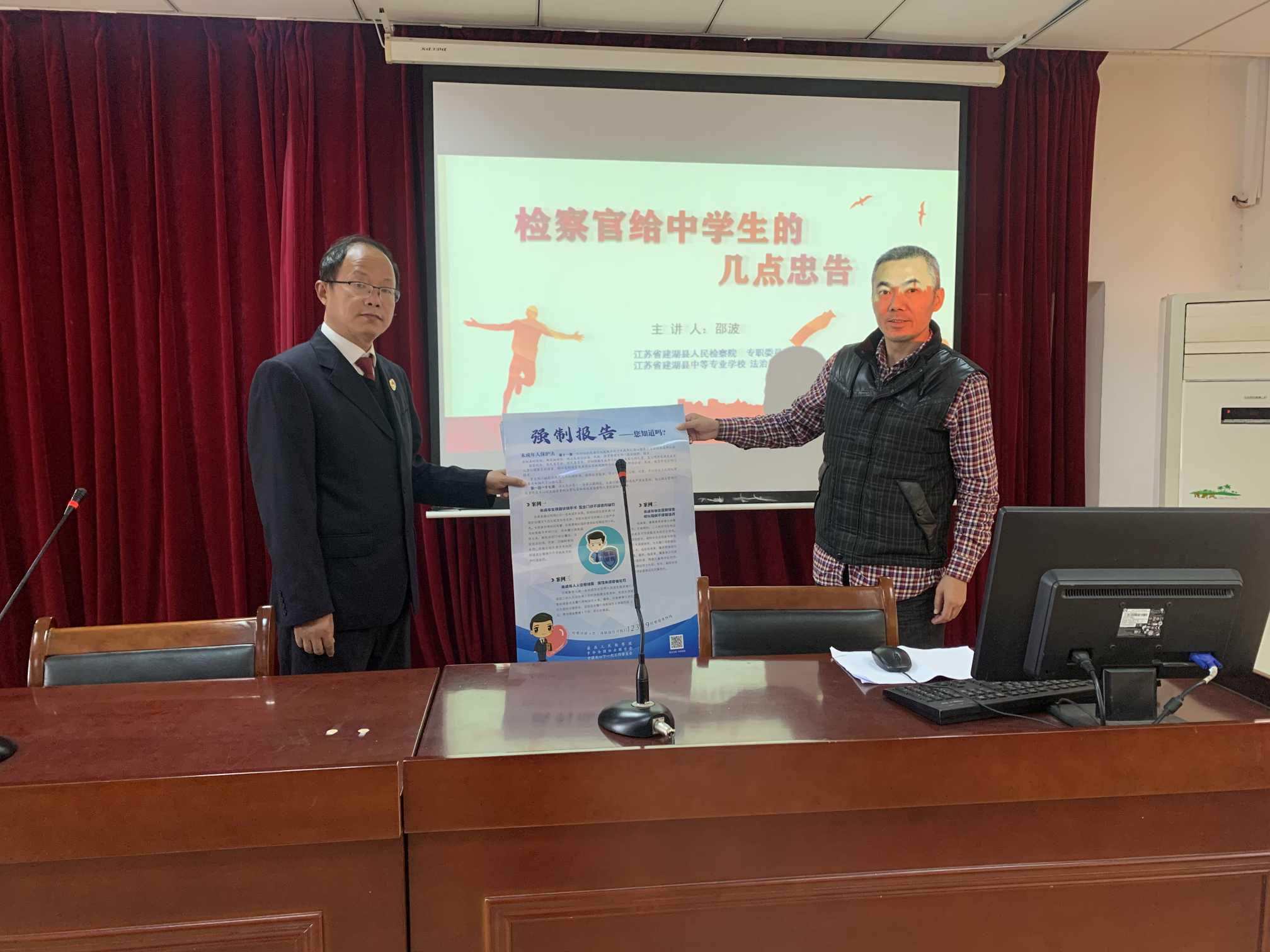 为增强在校学生自觉守法和自我保护意识,预防青少年违法犯罪,促进平安校园建设,建湖县人民检察院检委会专职委员、建湖县中等专业学校法治副校长邵波检察官为学校师生送上了一场生动的法治讲座,让同学们了解法律,敬畏法律,避免走向歧途。