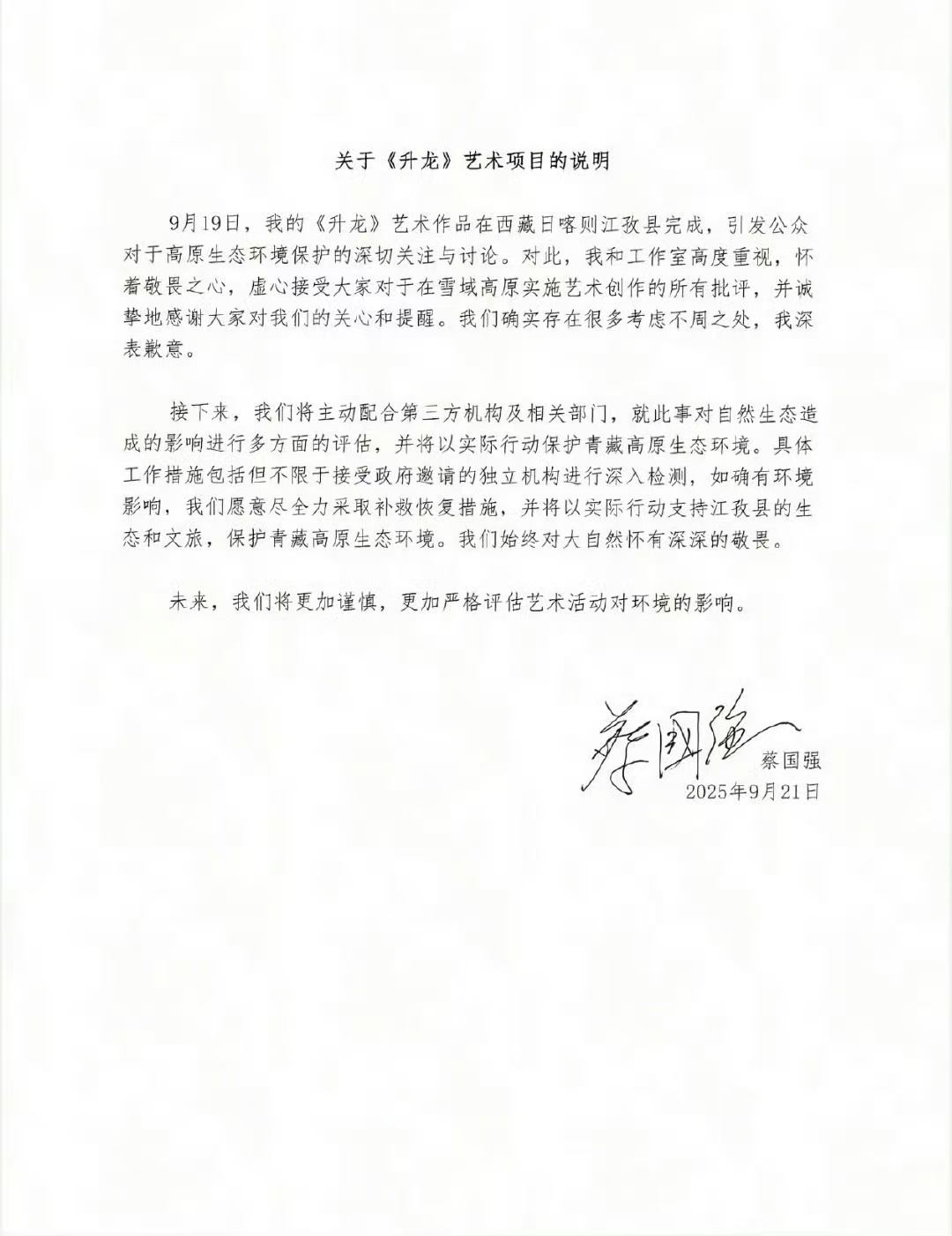 在网友持续不断的质疑与批评声中,9月21日,高端户外品牌始祖鸟与国际知名艺术家蔡国强终于就其于喜马拉雅山脉燃放的烟花作品《升龙》公开道歉。同日,日喀则市委、市政府宣布成立调查组赶赴现场核查,并表示将依法依规处理后续事宜。